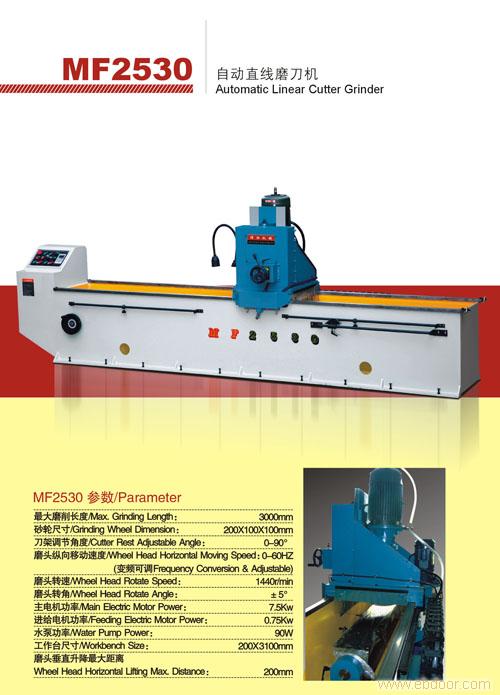 本机床主要用于刃磨各种不同角度的直刃刀具,适合于家具厂、木材加工厂、印刷厂、纺织厂等行业的各种不同类型的直刃刀具。该机主要由床身、工作台、溜板、磨头、自动进刀、电气、冷却等七大部分组成,各部分结构合理紧凑,外形布置美观合理。